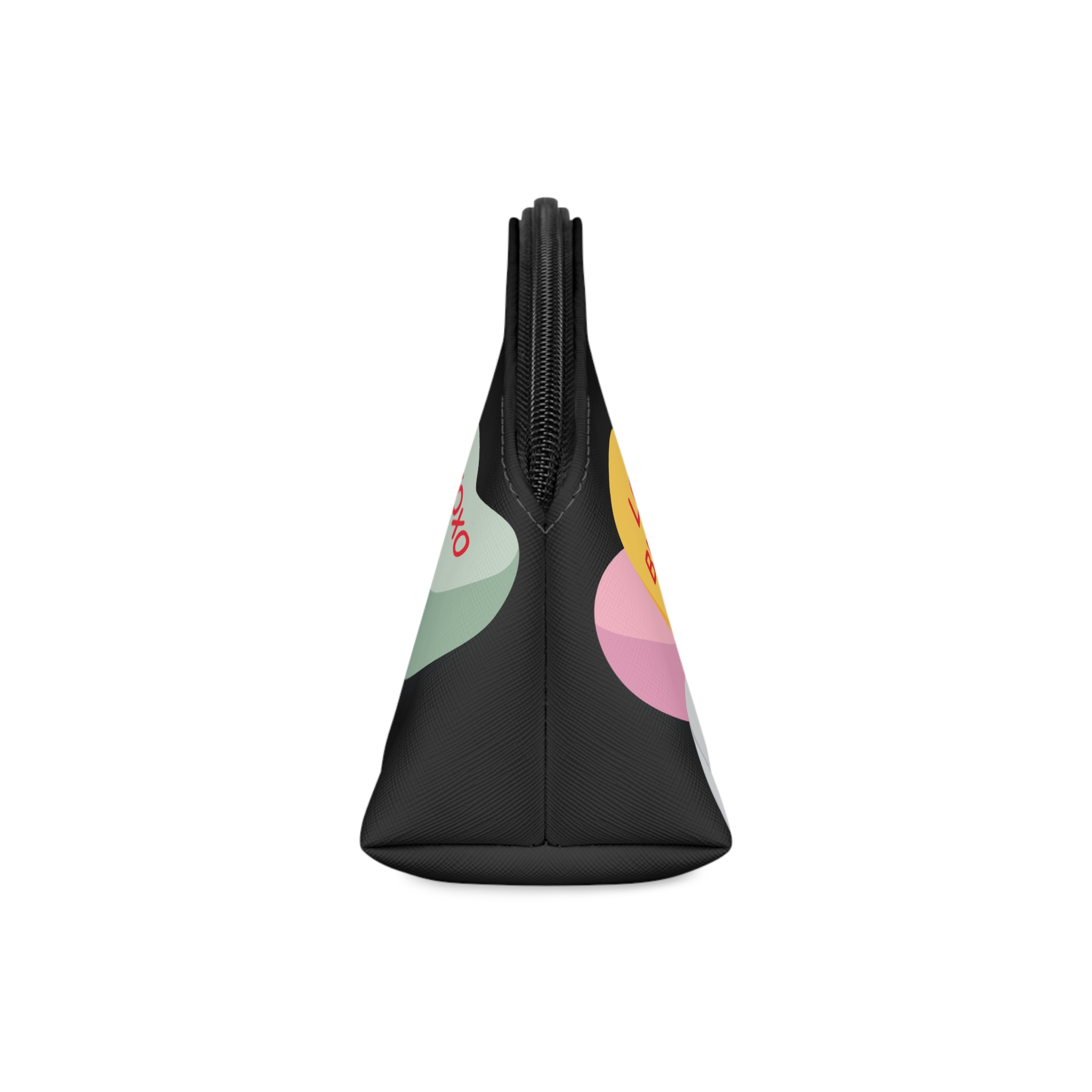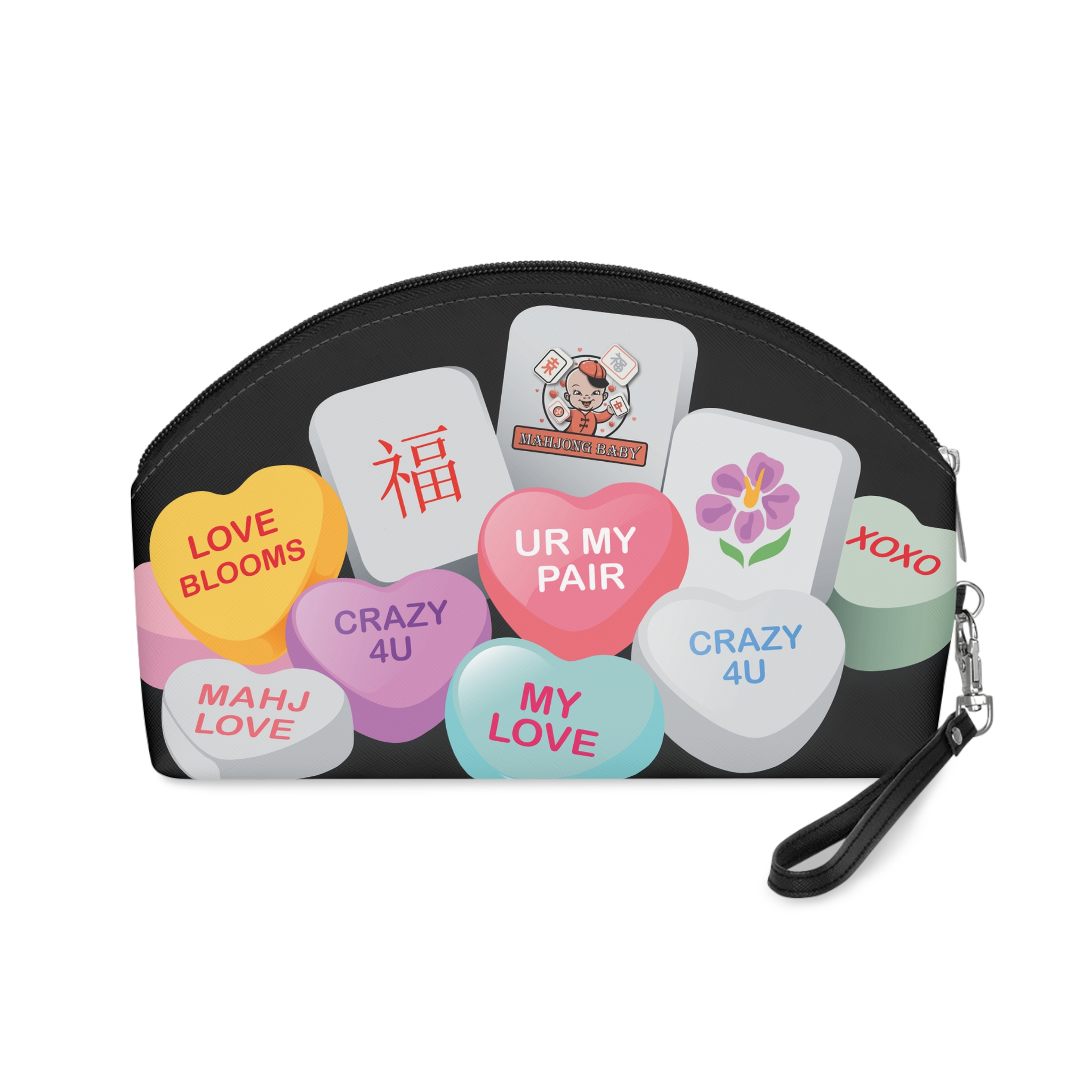 Bright, playful, and made for everyday moments — this curved makeup bag carries a pocketful of nostalgia. Rounded candy-heart graphics and colorful mahjong tiles sit against a deep background, creating a cheerful contrast that feels both modern and sentimental. Lightweight and compact, it slips into a tote or becomes a grab-and-go wristlet with the detachable strap. The smooth PU exterior prints vibrant colors that won’t fade, while the black interior keeps makeup smudges discreet. Reach in quickly with the durable zipper and find everything in one organized compartment. It’s a small ritual: a dash of color, a little luck, and a dependable pouch for daily beauty essentials.