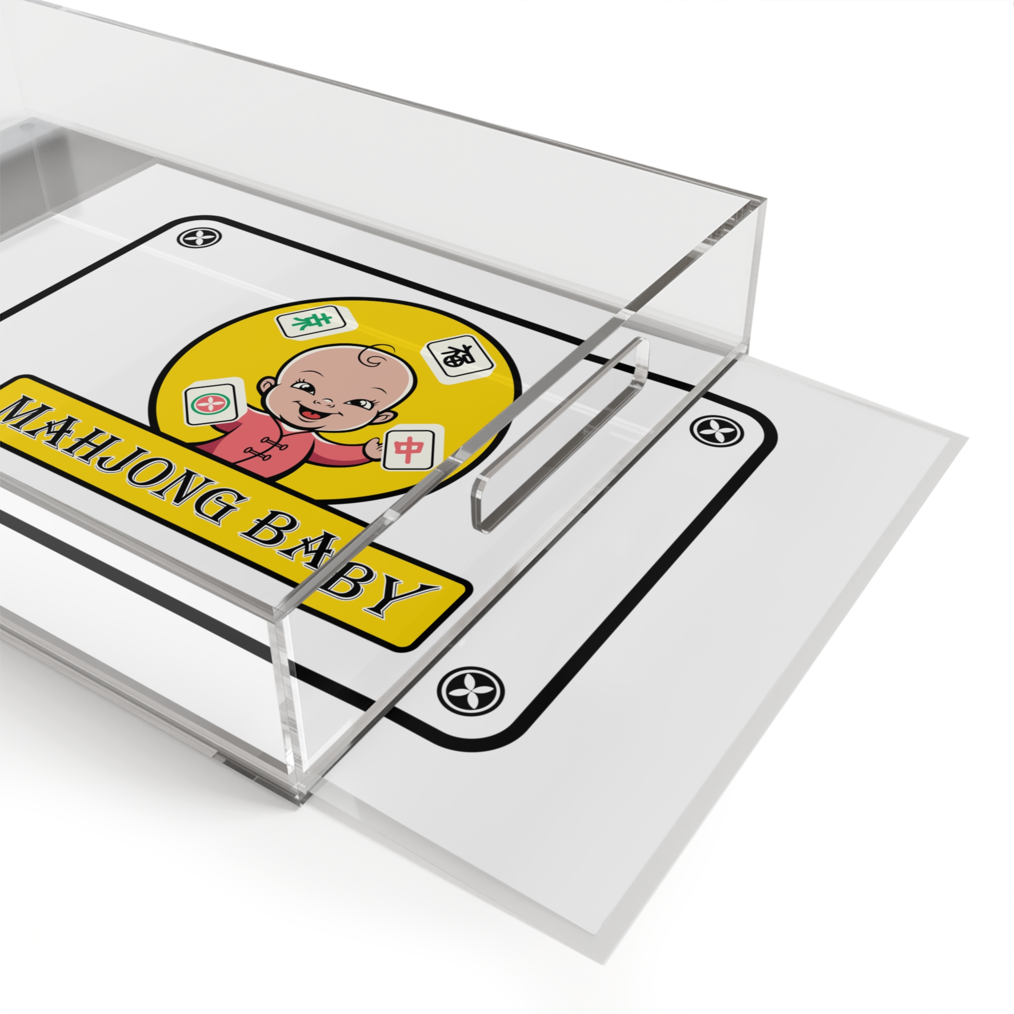 A cheerful acrylic serving tray that brings cozy Mahjong-table magic to holiday gatherings. The clear acrylic frame showcases a laminated white-base art insert featuring three festive gnomes holding Mahjong tiles, soft snowflakes, and a warm “Merry Mahjong” script. It feels light yet substantial in hand, slides easily across a table, and adds a playful, seasonal touch to snack service, tea breaks, or game-night spreads. Place it on a coffee table. Bring playful, cozy Mahjong-table charm to your home with the Mahjong Baby Acrylic Serving Tray, featuring a bright yellow Mahjong game board design that instantly warms any gathering. This lightweight yet sturdy tray showcases a white-base laminated art insert inside a clear acrylic frame, keeping the colors crisp, vivid, and true to the original artwork. Whether you’re serving snacks, displaying teacups, organizing essentials, or elevating your game-night setup, this tray adds a cheerful touch that sparks conversation and complements any Mahjong-lover’s décor.