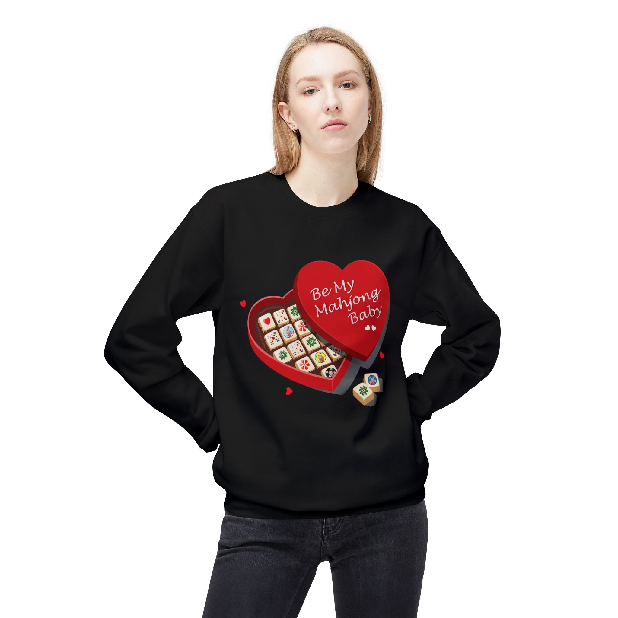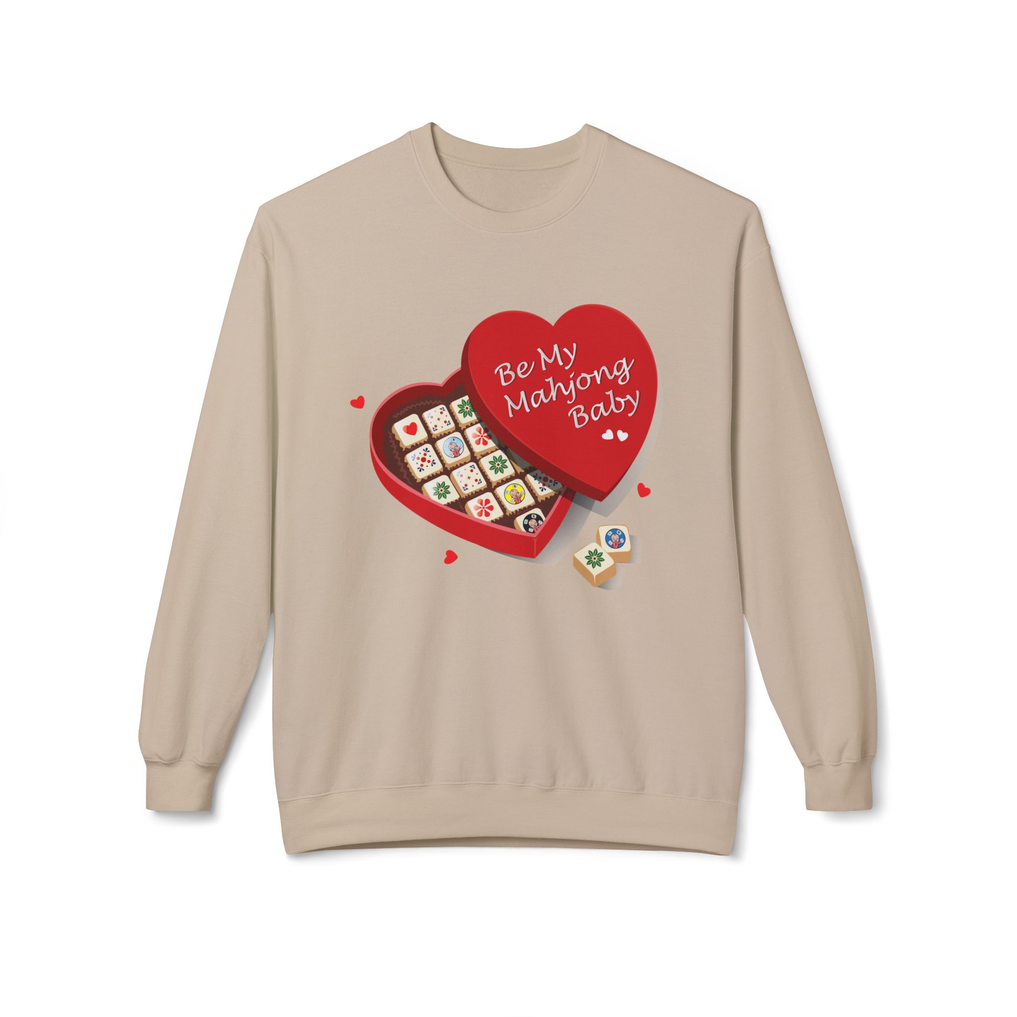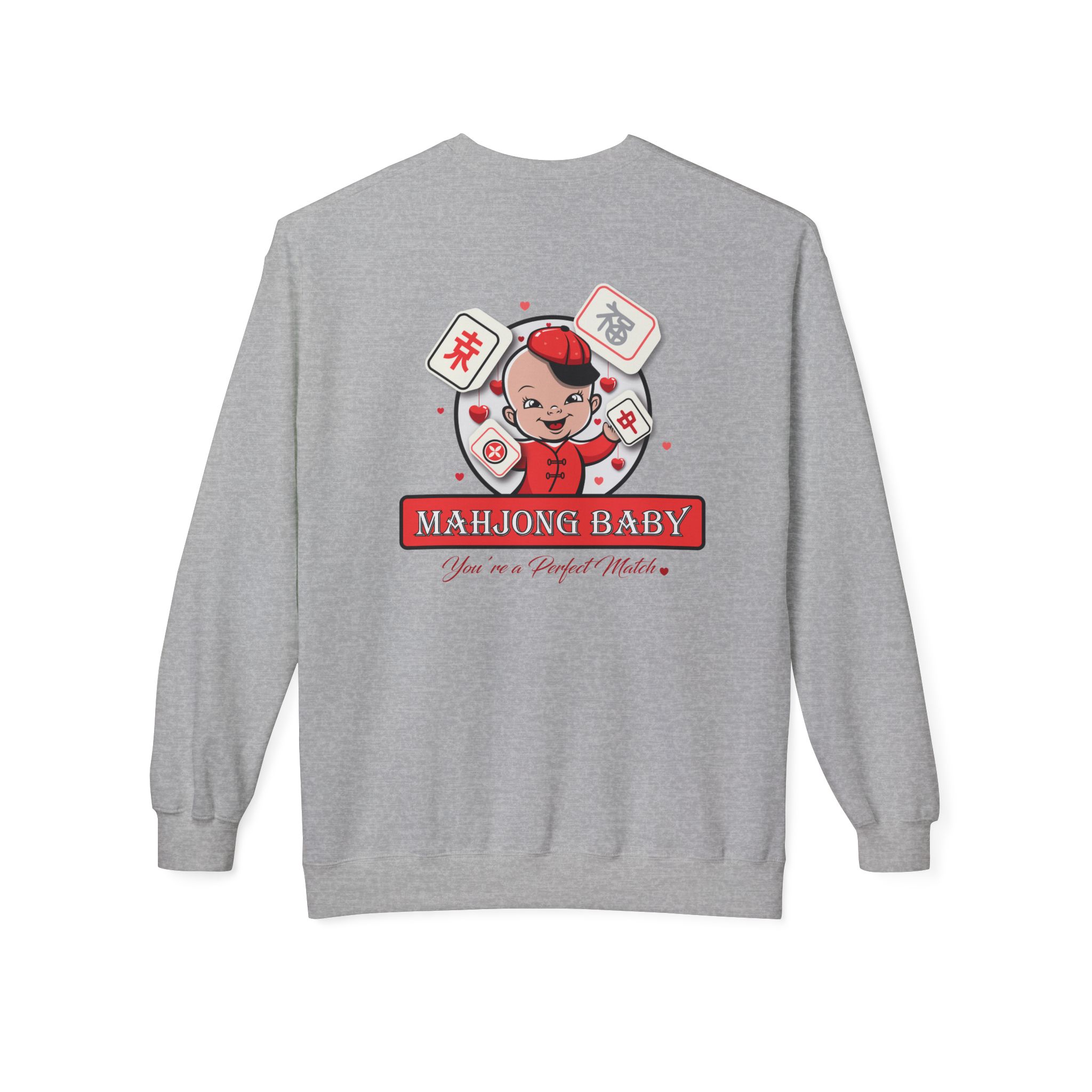 This cozy midweight crew captures playful charm and nostalgic warmth for anyone who loves mahjong, vintage Asian pop art, or quirky Valentine vibes. Soft against the skin, it wears like a well-loved sweatshirt while the front’s heart-shaped mahjong box and the back’s cheeky “Mahjong Baby” mascot tell a story of late-night games, laughter-filled gatherings, and small, affectionate competitions. Wear it to game nights, casual meetups, or while lounging at home — it feels familiar and fun, like a friendly partner who always brings snacks and a winning tile.
