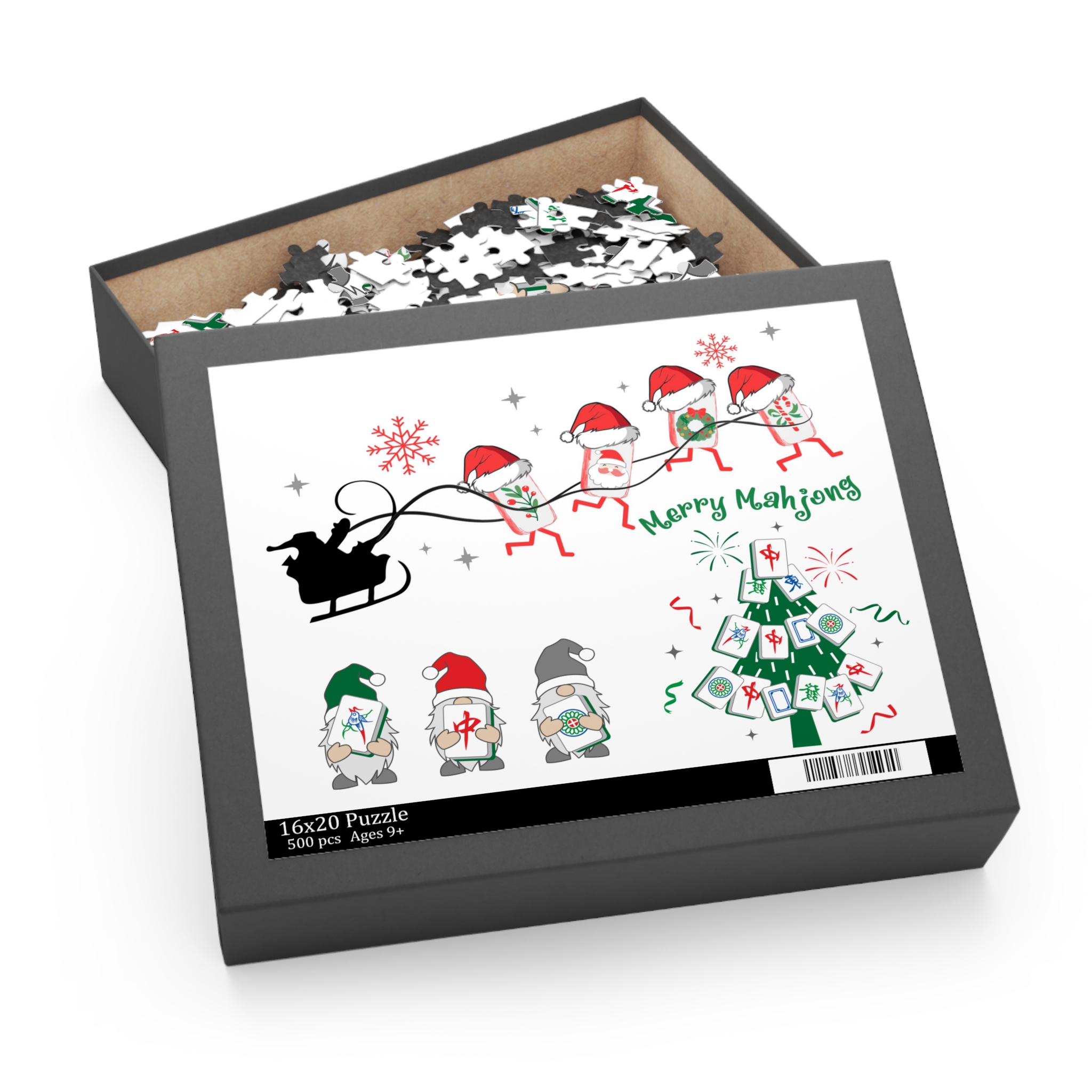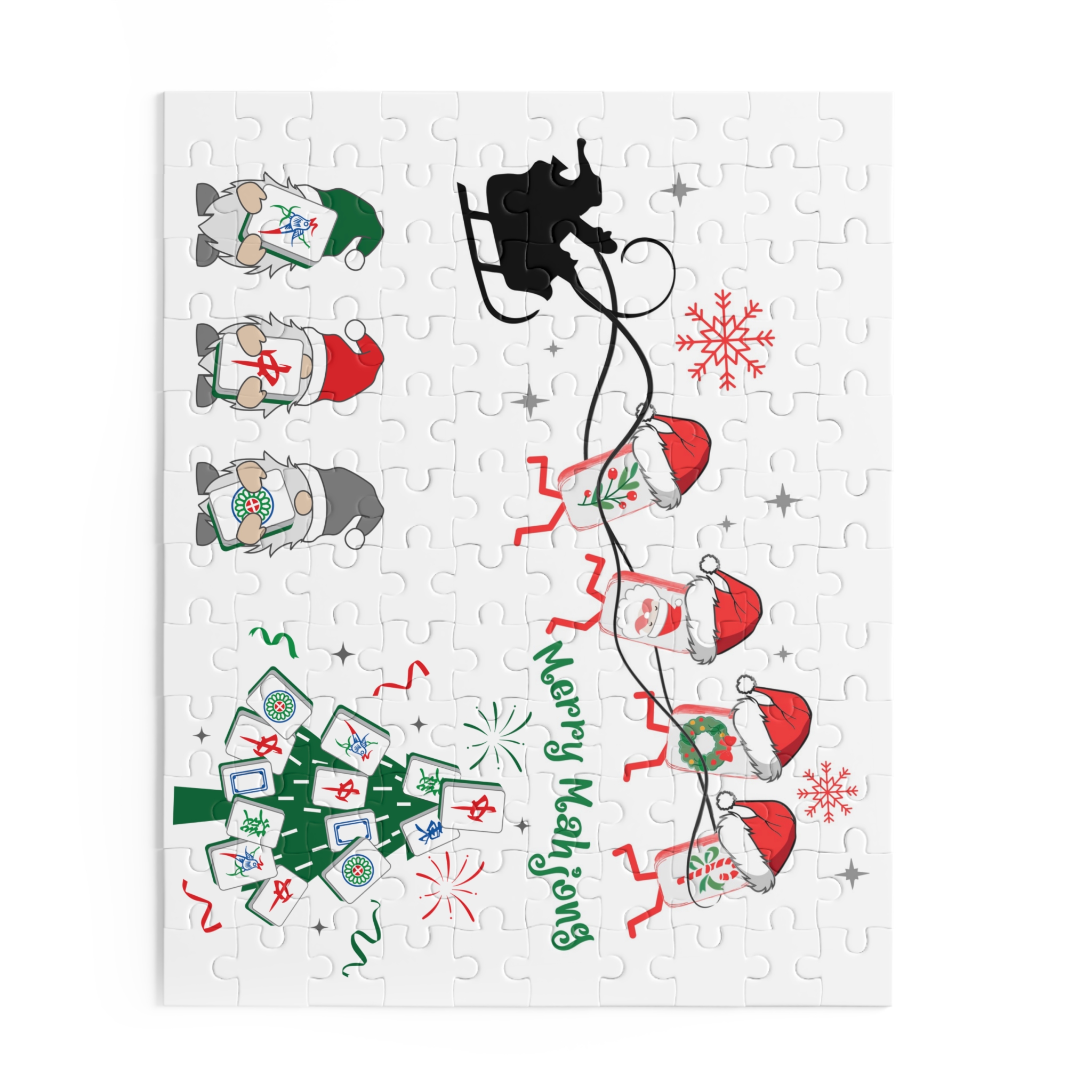 Celebrate the season with the Merry Mahjong Christmas Puzzle, featuring festive gnomes, Mahjong tiles in Santa hats, and a charming Mahjong Christmas tree. Printed in vibrant, glossy detail on sturdy chipboard, this cheerful holiday jigsaw brings together Mahjong lovers, puzzle fans, and families looking for a cozy seasonal activity.