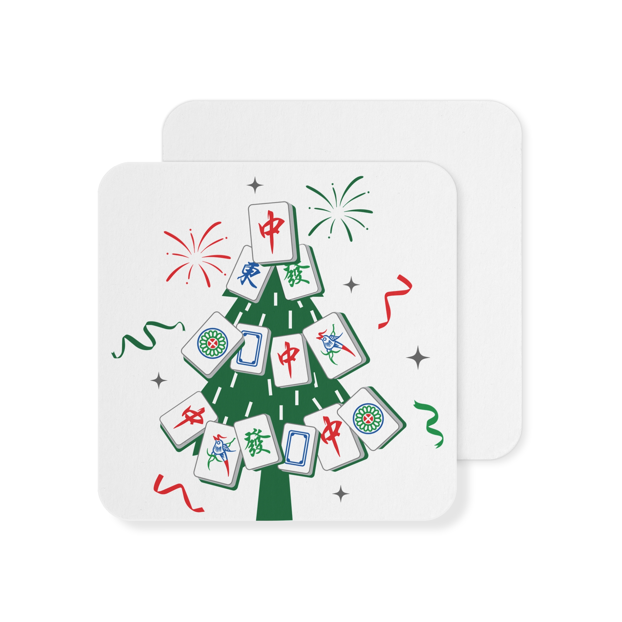 Choose between a 50-piece or 100-piece set—perfectly sized for everything from intimate Mahjong gatherings to large holiday parties. Each coaster features the same crisp “Merry Mahjong” artwork, printed on sturdy 50 pt hardboard that resists moisture and stays lightweight and easy to handle. Rounded corners add comfort and polish, making the whole set a delightful addition to any holiday décor or Mahjong lover’s home.