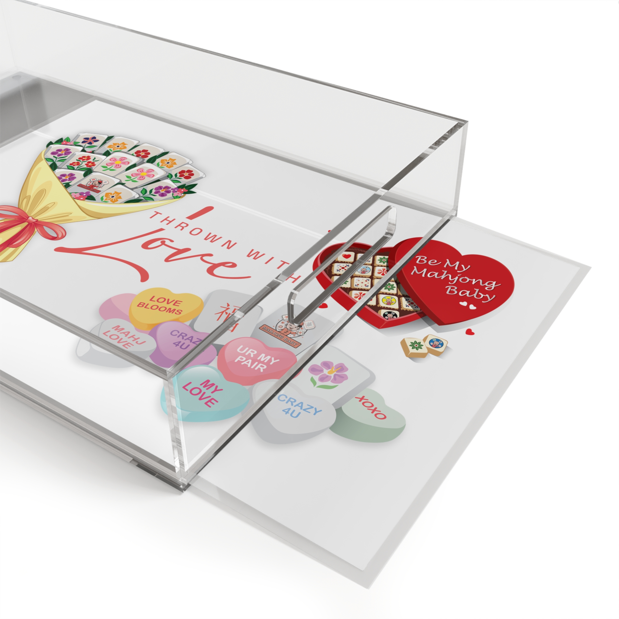 The Thrown With Love Mahjong tray features a beautifully illustrated mahjong design styled like a wrapped bouquet, paired with playful candy-heart details that celebrate friendship, game nights, and a love for the tiles.